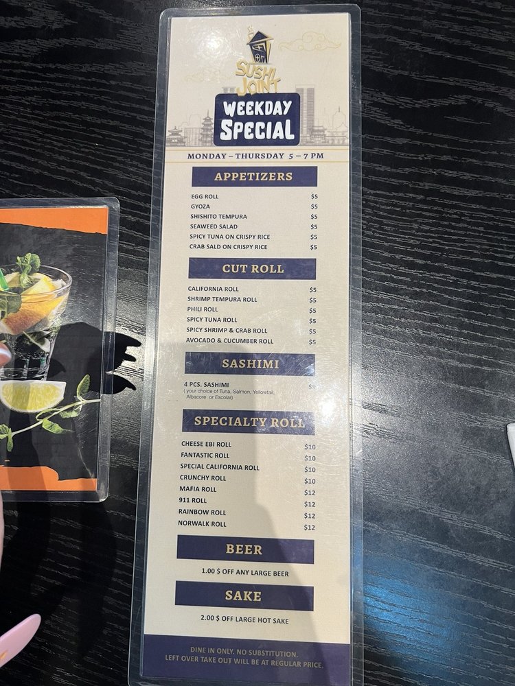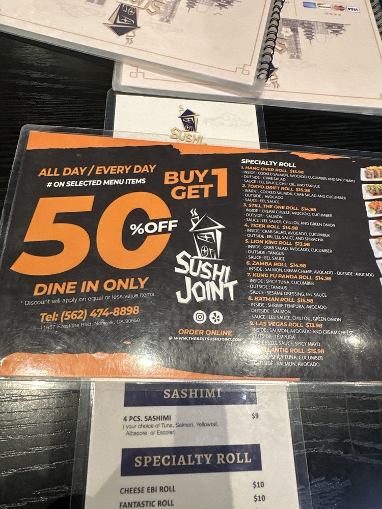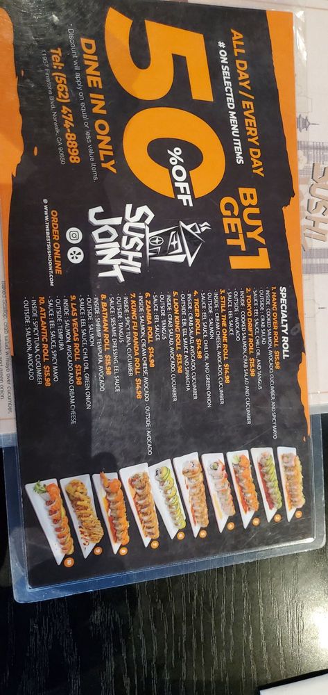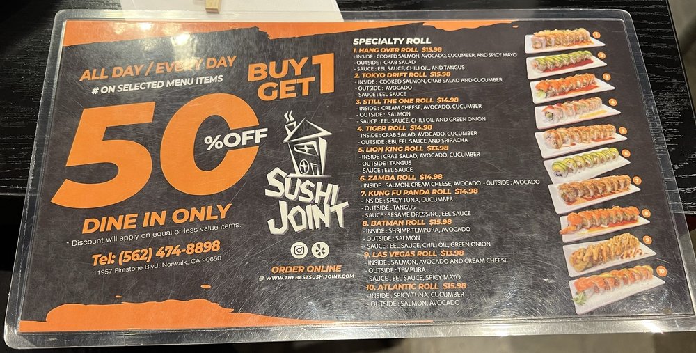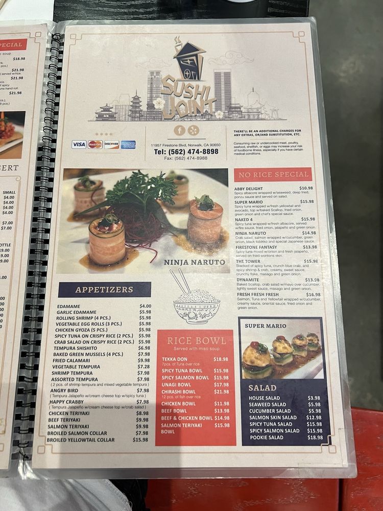 Introducing Sushi Joint, a Japanese sushi bar located at 11957 Firestone Blvd in Norwalk, CA. Offering takeout, reservations, and a variety of vegan and vegetarian options, Sushi Joint prides itself on accessibility and sustainability. With a casual yet trendy atmosphere, this restaurant caters to a diverse clientele, including groups and families. Customers rave about the high-quality sushi, excellent service, and fun ambiance. Standout dishes like the salmon aburi, black pearl roll, and broiled yellowtail collar showcase the creativity and freshness of the menu. Sushi Joint also offers daily specials and combo deals, making it a budget-friendly option without compromising on taste. Whether you're a sushi aficionado or a newcomer to Japanese cuisine, Sushi Joint promises a memorable dining experience with a focus on quality and value.